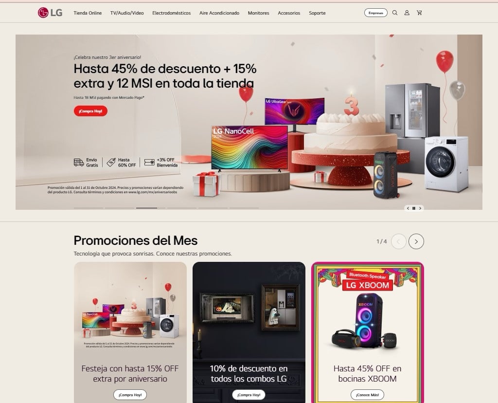 La tienda en línea de la reconocida marca LG Electronics México celebra 3 años, y para conmemorar esta ocasión, toda la tienda tendrá descuentos de hasta el 45% y 12 MSI hasta el 31 de octubre de este año.