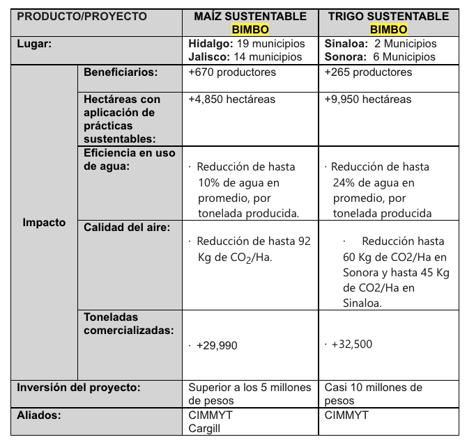 Como dato, Bimbo ha impulsado cultivos sustentables de maíz y trigo en más de 14,800 hectáreas en México. La empresa también impulsa proyectos de leche de cabra, cacao y papa, trigo sustentable, papa y otros productos, lo cual representa un impulso no sólo para los productores sino para el campo en general.